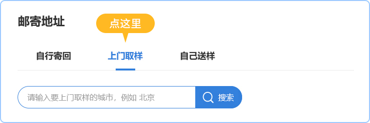 如果您需要上門(mén)取樣服務(wù),眾科檢測(cè)平臺(tái)下單時(shí),請(qǐng)選擇上門(mén)取樣服務(wù)并輸入上門(mén)取樣的城市即可,上門(mén)取樣人員會(huì)與您聯(lián)系,無(wú)需快遞,其他市縣需要郵寄。